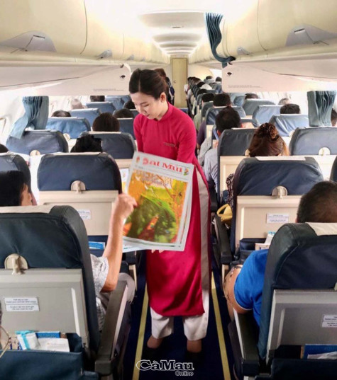 Báo Cà Mau đã phối hợp cùng với Tổng Công ty Hàng không Việt Nam - Công ty Cổ phần tại Cà Mau, Cảng Hàng không Cà Mau đưa các ẩn phẩm báo in của Báo Cà Mau phục vụ hành khách tại phòng chờ bay và trên các chuyến bay của VASCO. Ảnh: Tiếp viên hàng không phát phục vụ ấn phẩm Báo Cà Mau cho hành khách đi trên chuyến bay.