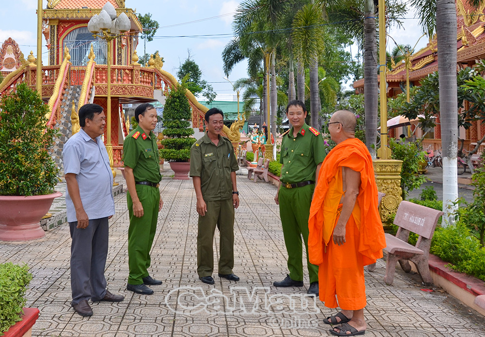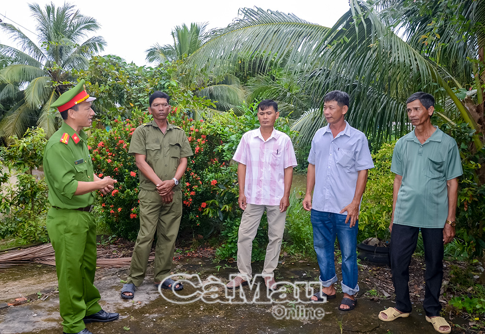Công an xã Ninh Thạnh Lợi trao đổi nghiệp vụ với các thành viên mô hình tự quản trên địa bàn.