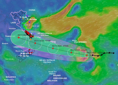 Dự báo đến 1h ngày 5/11, tâm bão ở phía tây miền Trung Philippines, sức gió mạnh nhất cấp 12-13, giật cấp 16, chuyển hướng tây tây bắc với tốc độ 20-25 km/h. Sáng cùng ngày, bão vào Biển Đông, mạnh trở lại do gặp vùng biển ấm.