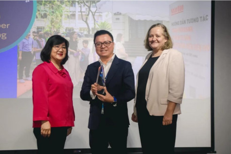 Tổng Biên tập Lê Quốc Minh, đại diện Báo Nhân Dân nhận cúp lưu niệm tại buổi lễ trao giải. Ảnh: WAN-IFRA