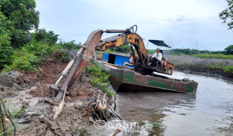 | Người dân trên địa bàn khóm Tam Hiệp, thị trấn Rạch Gốc, dùng cơ giới bồi đắp những khu vực trũng thấp, phòng tránh nước tràn vào vuông. |