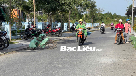 Nắp cống thoát nước bị mất trộm trên tuyến đường Nam Kỳ Khởi Nghĩa (Khu dân cư Phường 5, TP. Bạc Liêu) phải cắm cây khô, bao tải cảnh báo người đi đường. Ảnh: P.V
