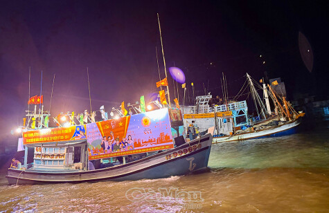 Xã Sông Đốc huy động cả ghe biển để tuyên truyền bầu cử, ảnh chụp tối 13/3/2026.