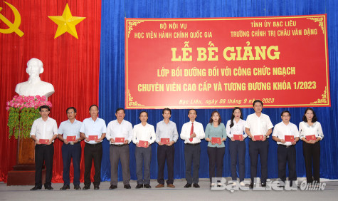 Chiều 8/9, Trường Chính trị Châu Văn Đặng phối hợp với Học viện Hành chính Quốc gia tổ chức lễ bế giảng lớp bồi dưỡng đối với công chức ngạch chuyên viên cao cấp và tương đương khóa 1 - năm 2023. Dự lễ bế giảng có đồng chí Hồ Thanh Thủy - Trưởng Ban Tổ chức Tỉnh ủy, Trưởng Ban tổ chức lớp bồi dưỡng.