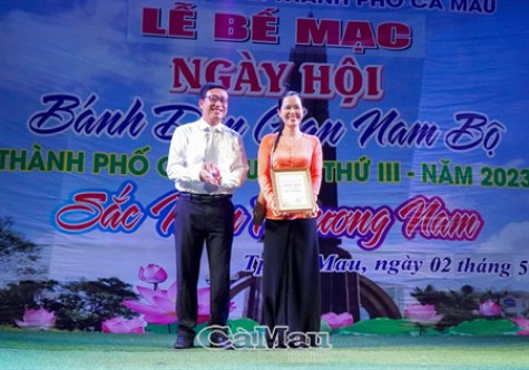 (CMO) Tối 2/5, Ngày hội Bánh dân gian Nam Bộ Tp. Cà Mau lần thứ III năm 2023 (Ngày hội) đã bế mạc. Ban Tổ chức trao thưởng cho 2 hội thi: Hội thi bánh dân gian Nam Bộ và Hội thi gói bánh tét.
