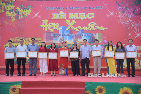 Ông Trần Văn Mậu - Phó Chủ tịch Thường trực UBND TP. Bạc Liêu, Trưởng Ban tổ chức Hội xuân trao giải cho các tập thể xuất sắc trong hội thi trang trí gian hàng.