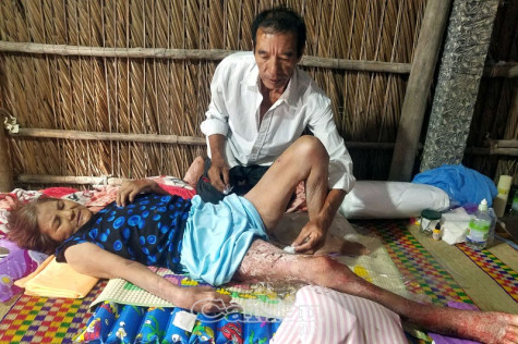 Hiện tại bà không ăn được gì, cố húp muỗng cháo trắng vào cũng nôn ra. Bà nằm yên một chỗ, việc ngồi lên, nằm xuống đều phải nhờ chồng đỡ, khi cử động toàn cơ thể đau đớn. Các vết loét chảy mủ gây mùi hôi rất nặng.
