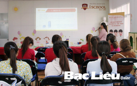 Bác sĩ Bệnh viện Đa khoa Thanh Vũ Medic Bạc Liêu hướng dẫn phòng bệnh tay chân miệng cho các giáo viên và phụ huynh Trường mầm non quốc tế iSchool Bạc Liêu. Ảnh: T.L
