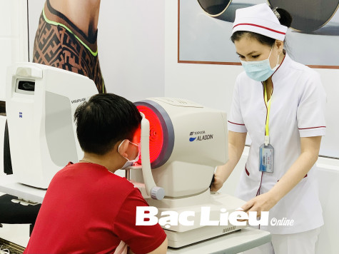 Nhân viên y tế Bệnh viện Đa khoa Thanh Vũ Medic thực hiện khám mắt cho bệnh nhân bằng kỹ thuật hiện đại.