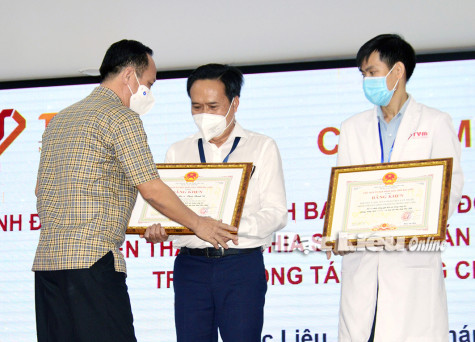 Chủ tịch UBND tỉnh - Phạm Văn Thiều tặng bằng khen cho ông Phạm Thanh Vũ - Tổng Giám đốc Bệnh viện Đa khoa Thanh Vũ Medic vì có đóng góp tích cực trong công tác phòng, chống dịch COVID-19 trên địa bàn tỉnh. Ảnh: C.K