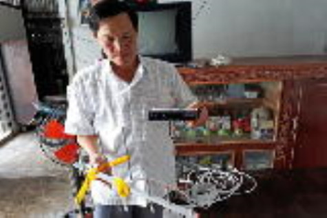 | Ông Lê Văn Cường bên thiết bị đầu thu kỹ thuật số mặt đất với giá 1,2 triệu đồng. |
