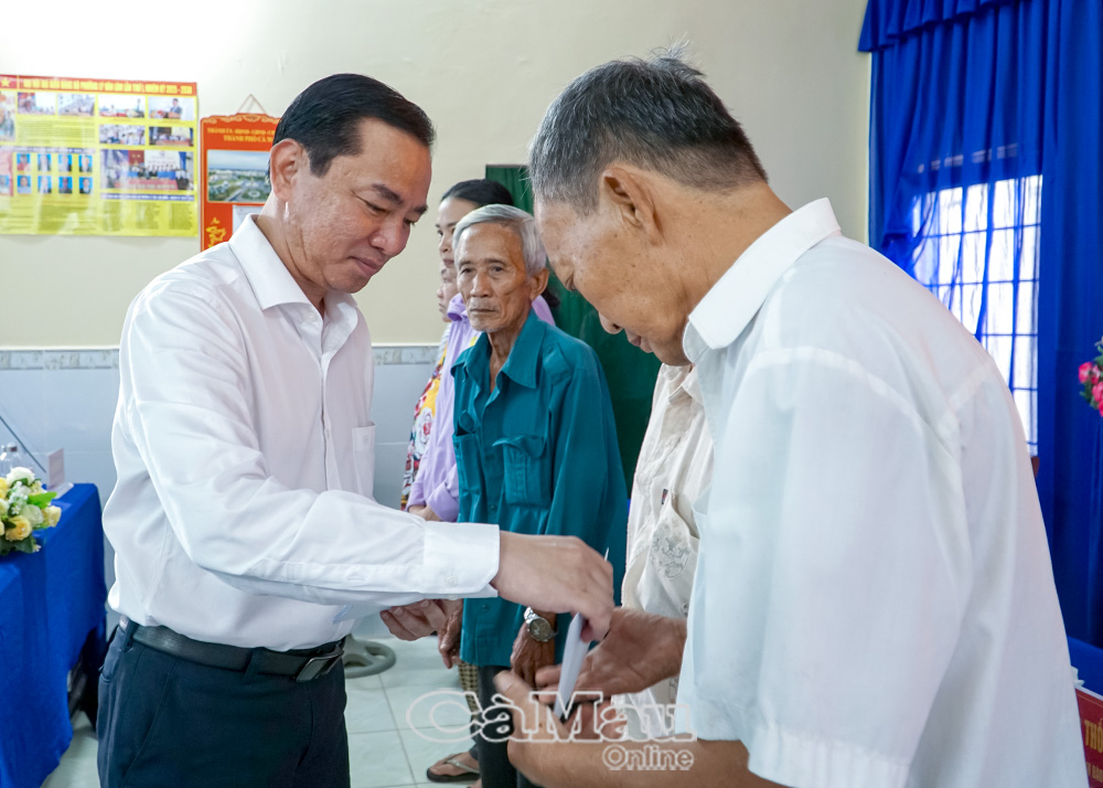 Trưởng ban Tổ chức Tỉnh uỷ Phan Thanh Duy trao quà của tỉnh tặng Ban công tác Mặt trận và người dân khóm Bào Sơn.