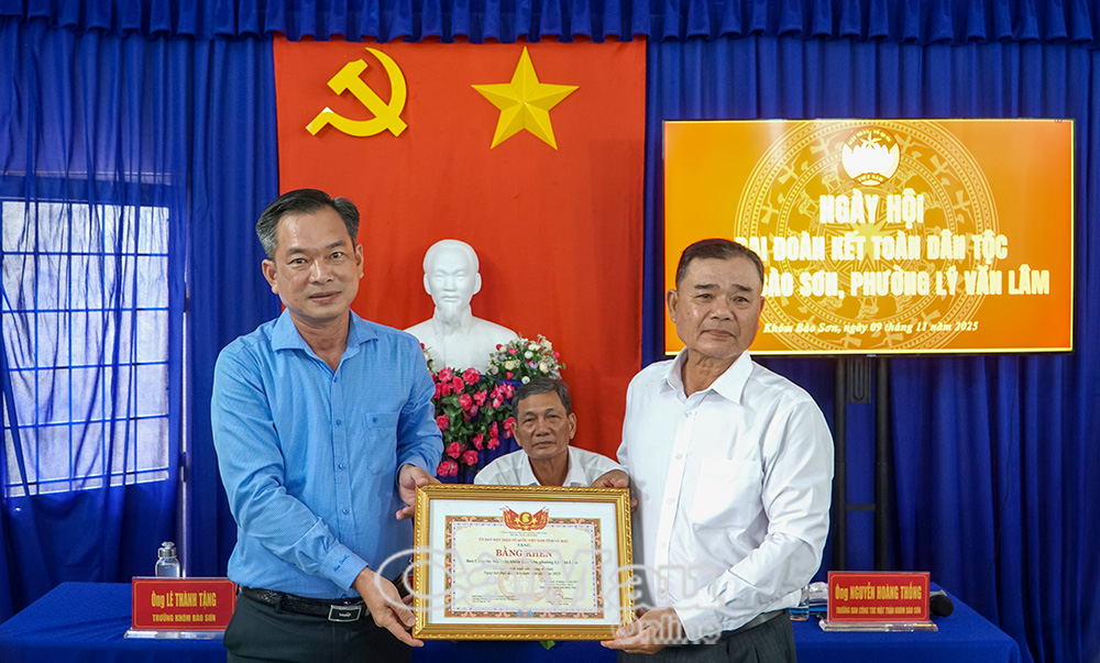 Đại diện lãnh đạo Uỷ ban MTTQ Việt Nam tỉnh Cà Mau trao Bằng khen của Uỷ ban MTTQ tỉnh tặng Ban công tác Mặt trận khóm Bào Sơn vì có thành tích xuất sắc trong tổ chức Ngày hội Đại đoàn kết toàn dân tộc năm 2025; lãnh đạo phường trao khen thưởng các tập thể, cá nhân và gia đình tiêu biểu của khóm.