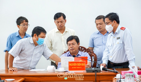 | Bí thư Tỉnh uỷ Cà Mau Nguyễn Tiến Hải trao đổi cùng công dân và lãnh đạo địa phương về vụ việc. |