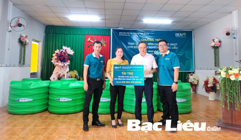Chiều 24/4, Ngân hàng TMCP Đầu tư và Phát triển Việt Nam - Chi nhánh Bạc Liêu (BIDV Bạc Liêu) thực hiện chương trình an sinh xã hội tài trợ 200 bồn chứa nước ngọt cho hộ nghèo ở xã Vĩnh Trạch Đông (TP. Bạc Liêu) với tổng trị giá 260 triệu đồng - (ảnh).