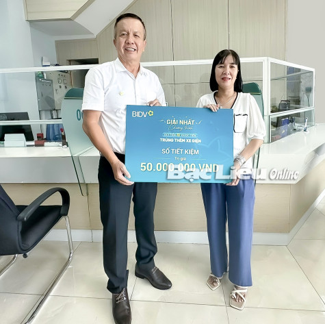 Sáng 17/10, Ngân hàng TMCP Đầu tư và Phát triển Việt Nam (BIDV) - Chi nhánh tỉnh Bạc Liêu đã tổ chức trao giải Nhất cho bà Hồ Thị Mới (TX. Giá Rai) trúng thưởng từ Chương trình “Gửi tiền được tiền, trúng thêm xe điện” với giá trị giải thưởng 50 triệu đồng - (ảnh).