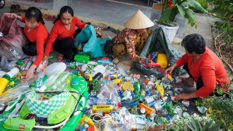 Phụ nữ ấp Chủ Mía , xã Khánh Hải, huyện Trần Văn Thời, mang chai nhựa, vỏ lon bia đến trụ sở ấp góp lại bán gây quỹ khởi nghiệp.