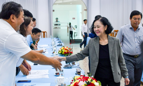 | Đồng chí Trương Thị Mai, Ủy viên Bộ Chính trị, Bí thư Trung ương Đảng, Trưởng ban Tổ chức Trung ương, Trưởng Đoàn kiểm tra ân cần thăm hỏi các đồng chí lãnh đạo Tỉnh ủy Cà Mau nhân chuyến công tác. |