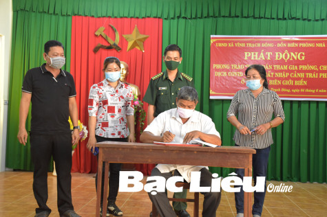 Lãnh đạo Đồn Biên phòng Nhà Mát cùng Bí thư Chi bộ các ấp xã Vĩnh Trạch Đông (TP. Bạc Liêu) ký cam kết phát động chống xuất nhập cảnh trái phép qua biên giới biển. Ảnh: T.Đ