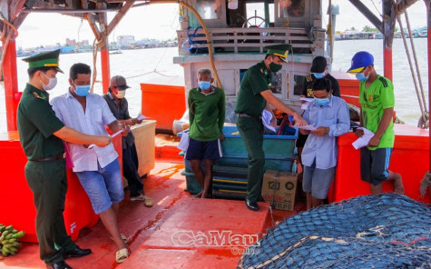 | Cán bộ Trạm Kiểm soát Biên phòng Sông Đốc phát tờ rơi hướng dẫn ngư dân nâng cao ý thức phòng, chống dịch. |