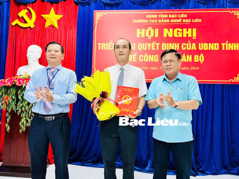 Chiều 24/10, UBND tỉnh tổ chức triển khai Quyết định bổ nhiệm viên chức quản lý của Trường cao đẳng Nghề Bạc Liêu. Ông Nguyễn Minh Thất - Phó Giám đốc Sở Nội vụ thừa ủy quyền của Chủ tịch UBND tỉnh triển khai quyết định.