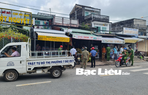 Lực lượng Phường 7, TP. Bạc Liêu nhắc nhở các cửa hàng mua bán mặt hàng không thiết yếu trên tuyến đường Hòa Bình phải đóng cửa, thực hiện nghiêm Chỉ thị 16. Ảnh: M.Đ