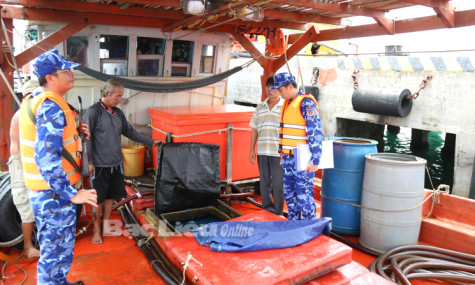 Lực lượng chức năng của Bộ Tư lệnh Vùng Cảnh sát biển 4 kiểm tra số dầu DO trên tàu.