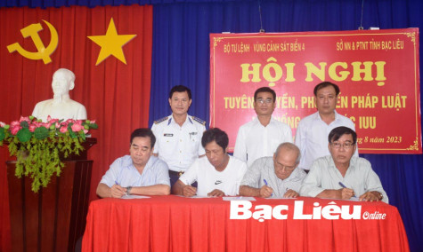 Lãnh đạo Bộ Tư lệnh Vùng cảnh sát biển 4 Bộ Tư lệnh Vùng cảnh sát biển 4 và Sở NN&PTNT tỉnh chứng kiến các ngư dân TP.Bạc Liêu ký cam kết không vi phạm về khai thác IUU.