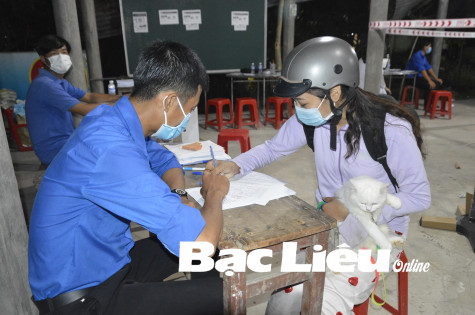 Nhân viên chốt phòng chống dịch COVID-19 (chốt Xẻo Chích, ấp Xẻo Chích, TT. Châu Hưng, huyện Vĩnh Lợi) hướng dẫn người dân khai báo y tế khi từ địa phương khác vào địa bàn tỉnh. Ảnh: C.K