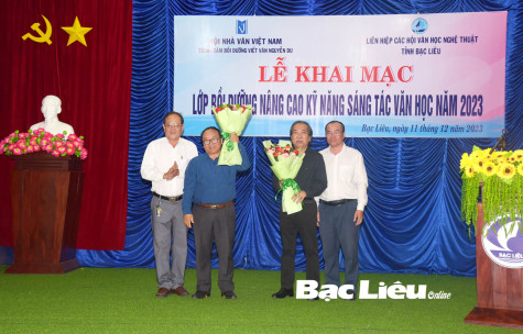 (BL-CT) Sáng 11/12, tại Khu lưu niệm nghệ thuật Đờn ca tài tử Nam Bộ và nhạc sĩ Cao Văn Lầu, Hội Nhà văn Việt Nam phối hợp với Liên hiệp các Hội Văn học - Nghệ thuật (VHNT) Bạc Liêu tổ chức khai giảng lớp bồi dưỡng nâng cao kỹ năng sáng tác văn học. Gần 40 học viên là hội viên các chi hội, phân hội thuộc Hội, Liên hiệp Hội VH-NT các tỉnh ĐBSCL dự học.