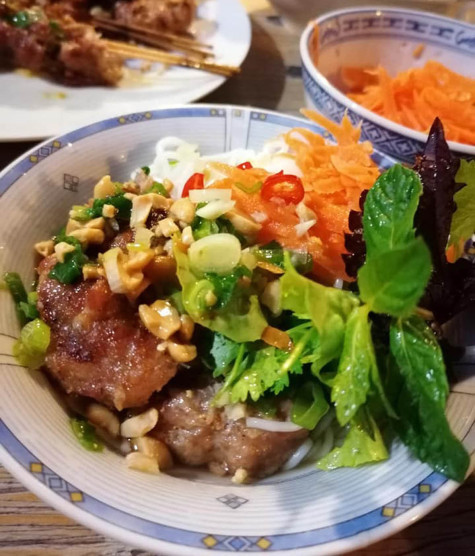 Chẳng hạn như món bún thịt nướng, trước khi thực hiện giãn cách xã hội, dù là ăn sáng hay ăn bữa xế thì chỉ cũng ăn ở quán, bởi thấy phải chuẩn bị lích kích nào là dưa chua, pha nước mắm, rang đậu phộng và “oải” nhất là khâu nướng thịt… là đã “đủ no”.