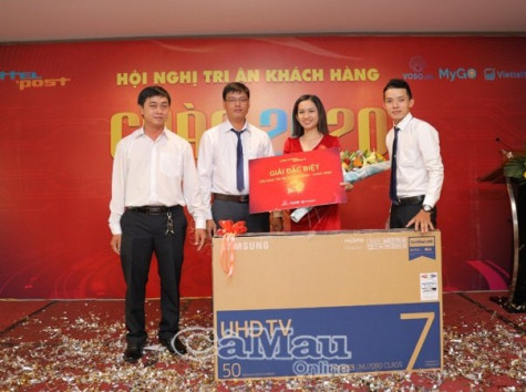 | Lãnh đạo Viettel Post Cà Mau trao thưởng cho khách hàng bốc thăm trúng giải đặc biệt tại buổi tri ân khách hàng |