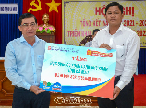 Dịp này, Nhà Xuất bản Giáo dục Việt Nam, Công ty Sách - Thiết bị Cửu Long trao trên 9.500 bản sách giáo khoa, trị giá trên 186 triệu đồng, cho học sinh nghèo tỉnh Cà Mau. (Trong ảnh: Ông Lê Hoàng Dự (bên trái), Phó giám đốc Sở Giáo dục và Đào tạo, nhận bảng tượng trưng từ đại diện Nhà Xuất bản Giáo dục Việt Nam, Công ty Sách - Thiết bị Cửu Long). |