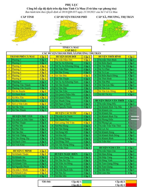 Theo đó, tỉnh Cà Mau thuộc cấp độ 2, trong đó có 4 đơn vị cấp huyện thuộc cấp 1 (màu xanh, nguy cơ thấp), gồm: Phú Tân, Ngọc Hiển, Trần Văn Thời và Năm Căn. 5 đơn vị thuộc cấp 2 (màu vàng, nguy cơ trung bình), gồm các huyện: Đầm Dơi, Thới Bình, U Minh, Cái Nước và TP. Cà Mau.
