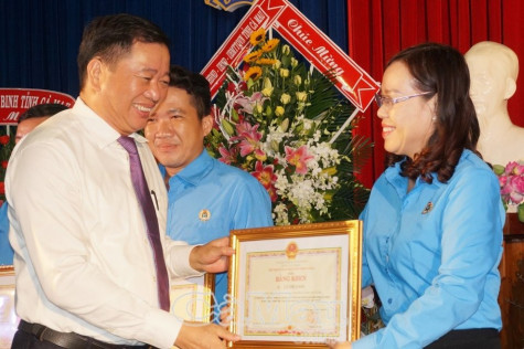 Phó chủ tịch UBND tỉnh Cà Mau Thân Đức Hưởng trao Bằng khen của UBND tỉnh cho các tập thể có thành tích xuất sắc trong phong trào thi đua cao điểm chào mừng kỷ niệm 90 năm ngày thành lập Công đoàn Việt Nam.