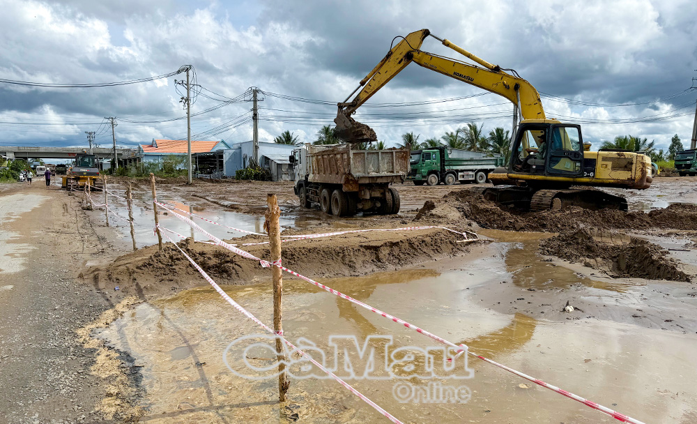 Cà Mau mong muốn Trung ương tiếp tục quan tâm đầu tư kết cấu hạ tầng giao thông vùng ĐBSCL, tập trung vào đường bộ cao tốc, đường sắt tốc độ cao và cảng biển. (Ảnh: Hoạt động thi công trên công trình tuyến cao tốc, đoạn qua ấp Kinh 5B, xã Trí Phải, ngày 30/10/2025)
