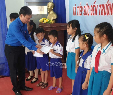 | Đại diện Tỉnh đoàn Cà Mau trao học bổng cho các em học sinh có hoàn cảnh khó khăn. |