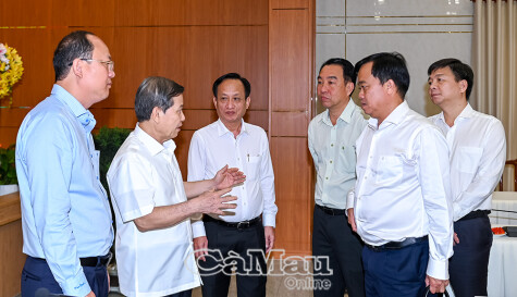 Đồng chí Lê Minh Trí, Uỷ viên Bộ Chính trị, Bí thư Trung ương Đảng, Trưởng ban Nội chính Trung ương, Trưởng đoàn Kiểm tra, giám sát số 22 của Bộ Chính trị, Ban Bí thư, trao đổi với các đồng chí trong Thường trực Tỉnh uỷ Cà Mau, bên lề buổi làm việc.