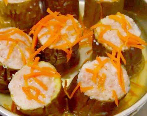 Thịt heo chọn loại vừa có nạc, có mỡ mới ngon. Bằm nhuyễn thịt với đầu hành lá. Trộn đều thịt với nấm mèo, ướp với chút đường, hạt nêm, nước mắm và tiêu xay, trộn đều, để khoảng 5 phút cho thịt thấm gia vị. Cho thịt vào túi nylon hoặc đeo bao tay, ém chặt thịt thành khối, ném xuống đáy tô nhiều lần để thịt có độ dai, dẻo. Dồn thịt vào từng khúc cà, nén chặt tay để khi hấp nhân không bị rơi ra ngoài.