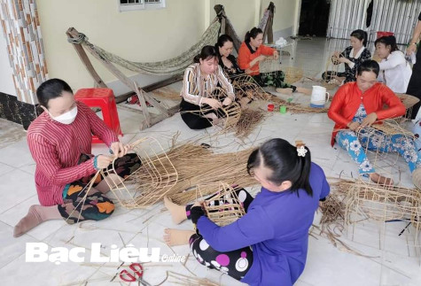 Hội viên, phụ nữ ấp 2 (xã Phong Thạnh Tây B, huyện Phước Long) tham gia lớp học nghề đan năn tượng. Ảnh: T.T