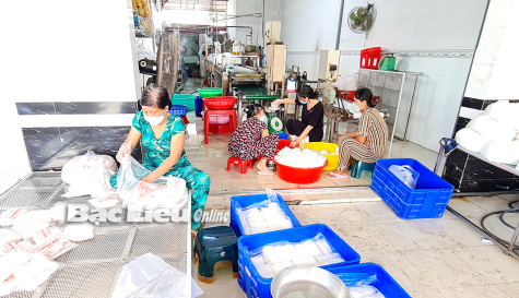 Mấy ngày qua, không khí làm việc ở Cơ sở sản xuất bánh hỏi, bún, hủ tíu Thanh Mai (Phường 1, TP. Bạc Liêu) luôn khẩn trương, hối hả. Các loại máy trộn bột, nồi hấp… hoạt động hết công suất để kịp thời giao hàng trong ngày. Chị Giang Kim Mai - chủ Cơ sở sản xuất bánh hỏi, bún, hủ tíu Thanh Mai, chia sẻ: “Trung bình mỗi ngày cơ sở sản xuất trên 200kg bánh hỏi, 300 - 400kg bún, hủ tíu và trên 100kg bánh lọt. Những ngày cận Tết, đơn hàng tăng gấp 2 - 3 lần, chúng tôi phải huy động thêm nhân công mới kịp lượng hàng cung ứng cho thị trường”.