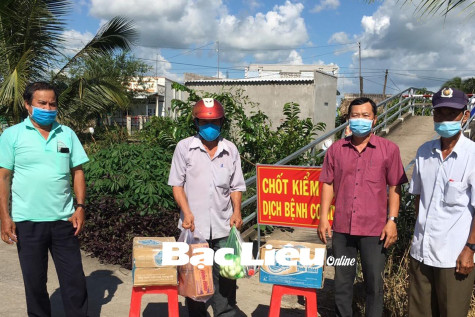 Ông Đặng Văn Chiểu - Phó Chủ tịch Hội Nông dân huyện Phước Long (thứ hai từ phải sang) tặng quà chốt kiểm soát dịch bệnh COVID-19 xã Hưng Phú. Ảnh: N.Q
