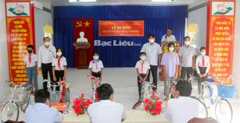 Tặng xe đạp cho học sinh tại lễ ra quân Năm Dân vận khéo huyện Hồng Dân 2022 tại xã Ninh Hòa.