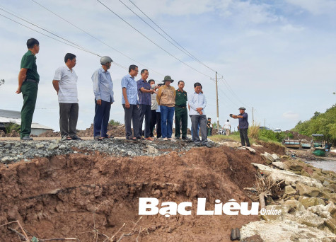 Đoàn công tác của UBND tỉnh thị sát, tìm giải pháp khắc phục, xử lý tình trạng sạt lở đê biển. Ảnh: C.L