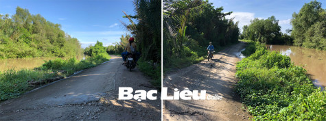 Đường Công Điền - Bờ Xáng (đoạn qua ấp Công Điền, xã Vĩnh Trạch, TP. Bạc Liêu) thời gian gần đây bị sụt lún, nghiêng hẳn về phía kênh thủy lợi gây tiềm ẩn các nguy cơ mất an toàn cho người tham gia giao thông (ảnh), nhất là vào ban đêm không có đèn chiếu sáng.