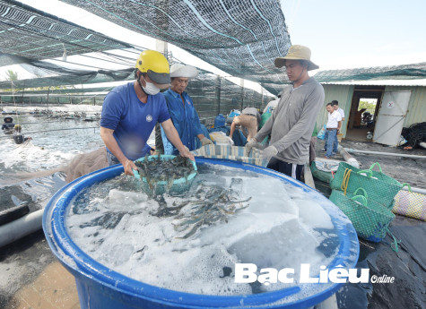 Thu hoạch tôm công nghiệp trên địa bàn TP. Bạc Liêu. Ảnh: H.T