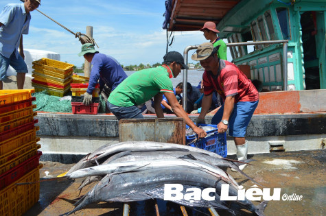 Ngư dân huyện Đông Hải vận chuyển cá sau chuyến đánh bắt trên biển.