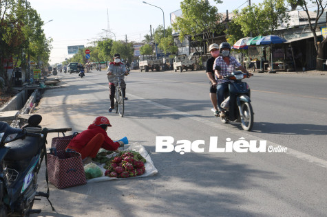 Người dân bày bán hàng hóa ngay trên phần đường xe cộ lưu thông (ảnh chụp trên đường 23/8, TP. Bạc Liêu).