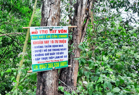 Dọc theo tuyến lộ chạy dài từ xã Khánh An tới hết địa bàn xã Nguyễn Phích (huyện U Minh), cứ cách khoảng 50 m lại có biển treo lủng lẳng trên cây với nội dung cho vay không cần thế chấp và kèm theo là số điện thoại của người cho vay. Hiển nhiên những “ngân hàng trên cây” này mọc lên như nấm sau mưa nhan nhản trước mặt người tham gia giao thông, rất dễ dàng nhìn thấy.