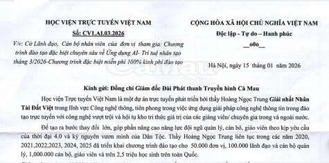 Thời gian gần đây, nhiều cơ quan, đơn vị tại tỉnh Cà Mau đã nhận được văn bản từ tổ chức tự xưng là Học viện Trực tuyến Việt Nam mời tham gia khoá đào tạo chuyên sâu về trí tuệ nhân tạo (AI). Tuy nhiên, nhiều thông tin trong văn bản có dấu hiệu bất thường.